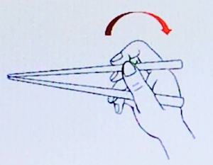 まずお箸の持ち方は、鉛筆を持つような要領で、お箸の長さを三等分するならば、上の三分の一を持ちます。